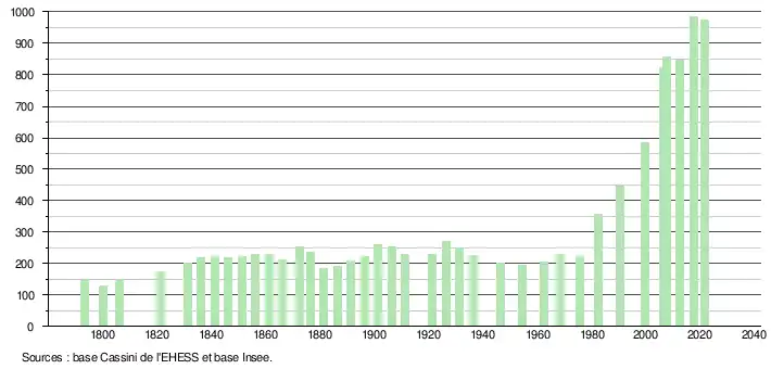 L'évolution du nombre d'habitants est connue à travers les recensements de la population effectués dans la commune depuis 1793. Pour les communes de moins de 10 000 habitants, une enquête de recensement portant sur toute la population est réalisée tous les cinq ans, les populations légales des années intermédiaires étant quant à elles estimées par interpolation ou extrapolation[23]. Pour la commune, le premier recensement exhaustif entrant dans le cadre du nouveau dispositif a été réalisé en 2007[24].