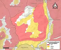 Le retrait-gonflement des sols argileux est susceptible d'engendrer des dommages importants aux bâtiments en cas d’alternance de périodes de sécheresse et de pluie. 88,7 % de la superficie communale est en aléa moyen ou fort (67,4 % au niveau départemental et 48,5 % au niveau national). Sur les 535 bâtiments dénombrés sur la commune en 2019, 519 sont en aléa moyen ou fort, soit 97 %, à comparer aux 81 % au niveau départemental et 54 % au niveau national. Une cartographie de l'exposition du territoire national au retrait gonflement des sols argileux est disponible sur le site du BRGM[26],[Carte 3].