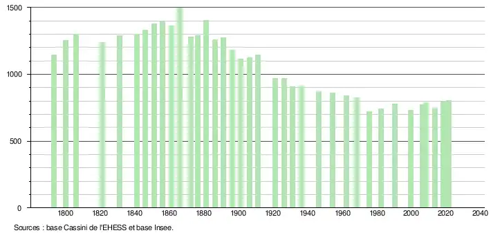 L'évolution du nombre d'habitants est connue à travers les recensements de la population effectués dans la commune depuis 1793. Pour les communes de moins de 10 000 habitants, une enquête de recensement portant sur toute la population est réalisée tous les cinq ans, les populations légales des années intermédiaires étant quant à elles estimées par interpolation ou extrapolation[41]. Pour la commune, le premier recensement exhaustif entrant dans le cadre du nouveau dispositif a été réalisé en 2008[42].
