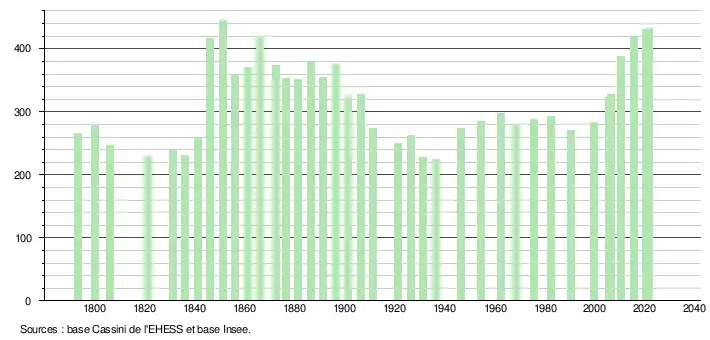 L'évolution du nombre d'habitants est connue à travers les recensements de la population effectués dans la commune depuis 1793. Pour les communes de moins de 10 000 habitants, une enquête de recensement portant sur toute la population est réalisée tous les cinq ans, les populations légales des années intermédiaires étant quant à elles estimées par interpolation ou extrapolation[22]. Pour la commune, le premier recensement exhaustif entrant dans le cadre du nouveau dispositif a été réalisé en 2005[23].