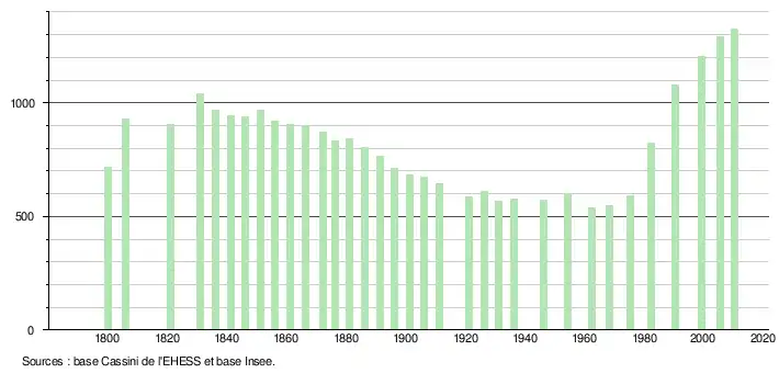 L'évolution du nombre d'habitants est connue à travers les recensements de la population effectués dans la commune depuis 1800. À partir du , les populations légales des communes sont publiées annuellement dans le cadre d'un recensement qui repose désormais sur une collecte d'information annuelle, concernant successivement tous les territoires communaux au cours d'une période de cinq ans. Pour les communes de moins de 10 000 habitants, une enquête de recensement portant sur toute la population est réalisée tous les cinq ans, les populations légales des années intermédiaires étant quant à elles estimées par interpolation ou extrapolation[12]. Pour la commune, le premier recensement exhaustif entrant dans le cadre du nouveau dispositif a été réalisé en 2005[13],[Note 1].