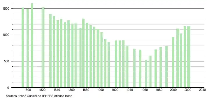 L'évolution du nombre d'habitants est connue à travers les recensements de la population effectués dans la commune depuis 1793. Pour les communes de moins de 10 000 habitants, une enquête de recensement portant sur toute la population est réalisée tous les cinq ans, les populations légales des années intermédiaires étant quant à elles estimées par interpolation ou extrapolation[28]. Pour la commune, le premier recensement exhaustif entrant dans le cadre du nouveau dispositif a été réalisé en 2005[29].