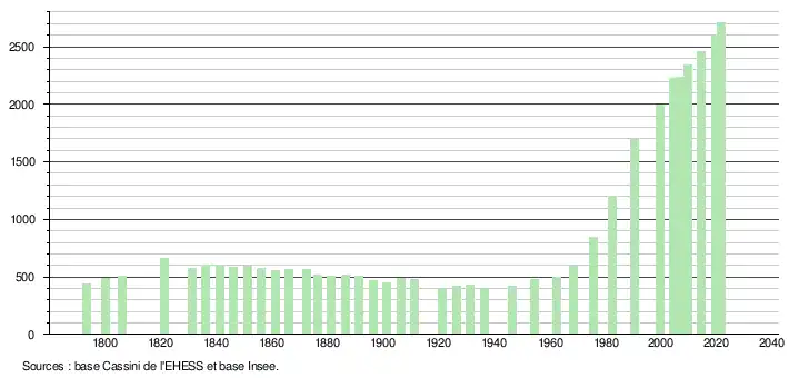 L'évolution du nombre d'habitants est connue à travers les recensements de la population effectués dans la commune depuis 1793. Pour les communes de moins de 10 000 habitants, une enquête de recensement portant sur toute la population est réalisée tous les cinq ans, les populations légales des années intermédiaires étant quant à elles estimées par interpolation ou extrapolation[24]. Pour la commune, le premier recensement exhaustif entrant dans le cadre du nouveau dispositif a été réalisé en 2004[25].