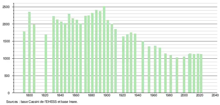 L'évolution du nombre d'habitants est connue à travers les recensements de la population effectués dans la commune depuis 1793. Pour les communes de moins de 10 000 habitants, une enquête de recensement portant sur toute la population est réalisée tous les cinq ans, les populations légales des années intermédiaires étant quant à elles estimées par interpolation ou extrapolation[24]. Pour la commune, le premier recensement exhaustif entrant dans le cadre du nouveau dispositif a été réalisé en 2007[25].