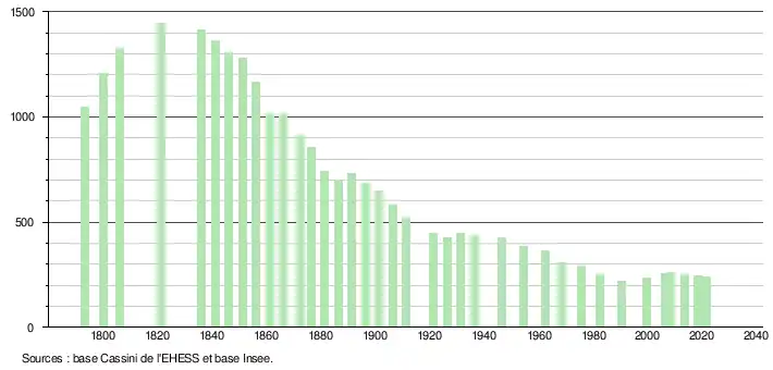 L'évolution du nombre d'habitants est connue à travers les recensements de la population effectués dans la commune depuis 1793. Pour les communes de moins de 10 000 habitants, une enquête de recensement portant sur toute la population est réalisée tous les cinq ans, les populations légales des années intermédiaires étant quant à elles estimées par interpolation ou extrapolation[22]. Pour la commune, le premier recensement exhaustif entrant dans le cadre du nouveau dispositif a été réalisé en 2008[23].