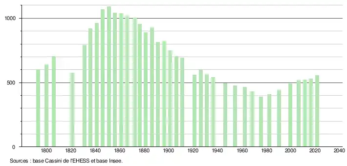 L'évolution du nombre d'habitants est connue à travers les recensements de la population effectués dans la commune depuis 1793. Pour les communes de moins de 10 000 habitants, une enquête de recensement portant sur toute la population est réalisée tous les cinq ans, les populations légales des années intermédiaires étant quant à elles estimées par interpolation ou extrapolation[17]. Pour la commune, le premier recensement exhaustif entrant dans le cadre du nouveau dispositif a été réalisé en 2006[18].