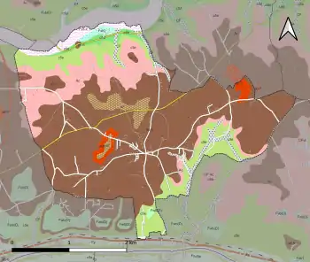 L'occupation des sols de la commune, telle qu'elle ressort de la base de données européenne d’occupation biophysique des sols Corine Land Cover (CLC), est marquée par l'importance des forêts et milieux semi-naturels (53,7 % en 2018), une proportion identique à celle de 1990 (54,1 %). La répartition détaillée en 2018 est la suivante : forêts (50,8 %), prairies (17,8 %), zones agricoles hétérogènes (13,3 %), zones urbanisées (10,3 %), terres arables (4,9 %), milieux à végétation arbustive et/ou herbacée (2,9 %)[35]. L'évolution de l’occupation des sols de la commune et de ses infrastructures peut être observée sur les différentes représentations cartographiques du territoire : la carte de Cassini (XVIIIe siècle), la carte d'état-major (1820-1866) et les cartes ou photos aériennes de l'IGN pour la période actuelle (1950 à aujourd'hui)[Carte 3].