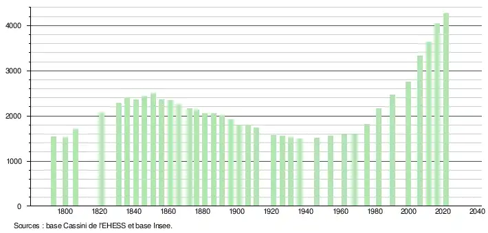 L'évolution du nombre d'habitants est connue à travers les recensements de la population effectués dans la commune depuis 1793. Pour les communes de moins de 10 000 habitants, une enquête de recensement portant sur toute la population est réalisée tous les cinq ans, les populations légales des années intermédiaires étant quant à elles estimées par interpolation ou extrapolation[25]. Pour la commune, le premier recensement exhaustif entrant dans le cadre du nouveau dispositif a été réalisé en 2006[26].