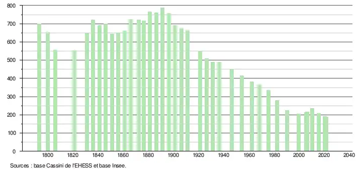 L'évolution du nombre d'habitants est connue à travers les recensements de la population effectués dans la commune depuis 1793. Pour les communes de moins de 10 000 habitants, une enquête de recensement portant sur toute la population est réalisée tous les cinq ans, les populations légales des années intermédiaires étant quant à elles estimées par interpolation ou extrapolation[14]. Pour la commune, le premier recensement exhaustif entrant dans le cadre du nouveau dispositif a été réalisé en 2005[15].