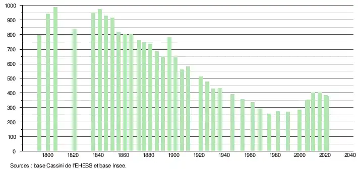 L'évolution du nombre d'habitants est connue à travers les recensements de la population effectués dans la commune depuis 1793. Pour les communes de moins de 10 000 habitants, une enquête de recensement portant sur toute la population est réalisée tous les cinq ans, les populations légales des années intermédiaires étant quant à elles estimées par interpolation ou extrapolation[30]. Pour la commune, le premier recensement exhaustif entrant dans le cadre du nouveau dispositif a été réalisé en 2005[31].