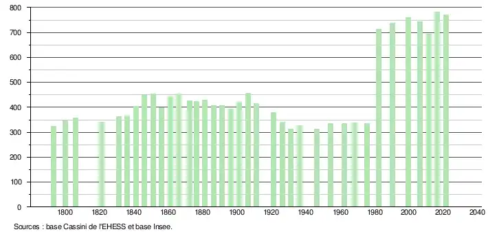 L'évolution du nombre d'habitants est connue à travers les recensements de la population effectués dans la commune depuis 1793. Pour les communes de moins de 10 000 habitants, une enquête de recensement portant sur toute la population est réalisée tous les cinq ans, les populations légales des années intermédiaires étant quant à elles estimées par interpolation ou extrapolation[26]. Pour la commune, le premier recensement exhaustif entrant dans le cadre du nouveau dispositif a été réalisé en 2006[27].