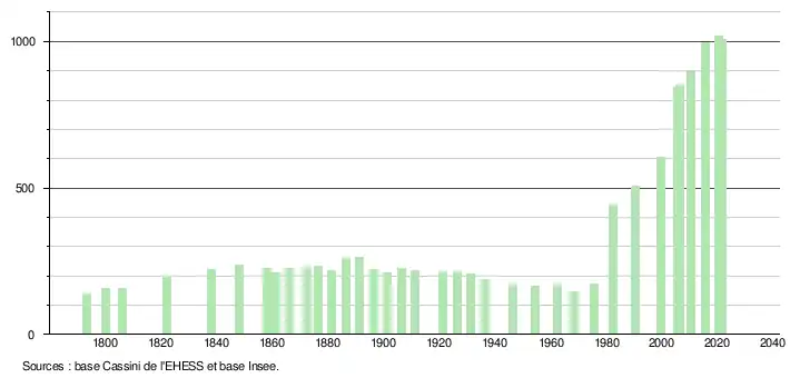 L'évolution du nombre d'habitants est connue à travers les recensements de la population effectués dans la commune depuis 1793. Pour les communes de moins de 10 000 habitants, une enquête de recensement portant sur toute la population est réalisée tous les cinq ans, les populations légales des années intermédiaires étant quant à elles estimées par interpolation ou extrapolation[11]. Pour la commune, le premier recensement exhaustif entrant dans le cadre du nouveau dispositif a été réalisé en 2005[12].