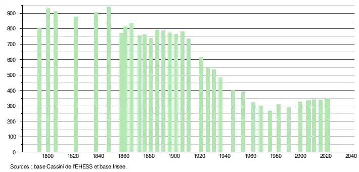 L'évolution du nombre d'habitants est connue à travers les recensements de la population effectués dans la commune depuis 1793. Pour les communes de moins de 10 000 habitants, une enquête de recensement portant sur toute la population est réalisée tous les cinq ans, les populations légales des années intermédiaires étant quant à elles estimées par interpolation ou extrapolation[21]. Pour la commune, le premier recensement exhaustif entrant dans le cadre du nouveau dispositif a été réalisé en 2005[22].