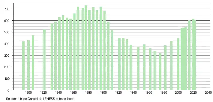 L'évolution du nombre d'habitants est connue à travers les recensements de la population effectués dans la commune depuis 1793. Pour les communes de moins de 10 000 habitants, une enquête de recensement portant sur toute la population est réalisée tous les cinq ans, les populations légales des années intermédiaires étant quant à elles estimées par interpolation ou extrapolation[18]. Pour la commune, le premier recensement exhaustif entrant dans le cadre du nouveau dispositif a été réalisé en 2004[19].