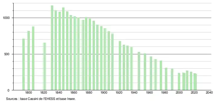 L'évolution du nombre d'habitants est connue à travers les recensements de la population effectués dans la commune depuis 1793. Pour les communes de moins de 10 000 habitants, une enquête de recensement portant sur toute la population est réalisée tous les cinq ans, les populations légales des années intermédiaires étant quant à elles estimées par interpolation ou extrapolation[25]. Pour la commune, le premier recensement exhaustif entrant dans le cadre du nouveau dispositif a été réalisé en 2005[26].