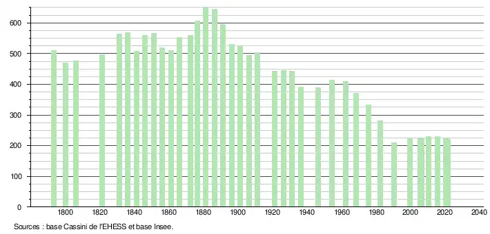 L'évolution du nombre d'habitants est connue à travers les recensements de la population effectués dans la commune depuis 1793. Pour les communes de moins de 10 000 habitants, une enquête de recensement portant sur toute la population est réalisée tous les cinq ans, les populations légales des années intermédiaires étant quant à elles estimées par interpolation ou extrapolation[17]. Pour la commune, le premier recensement exhaustif entrant dans le cadre du nouveau dispositif a été réalisé en 2005[18].
