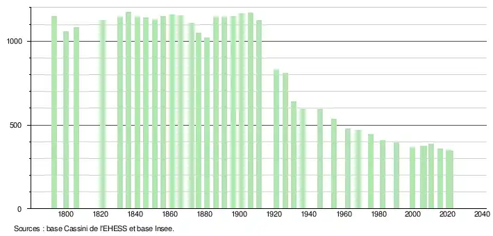 L'évolution du nombre d'habitants est connue à travers les recensements de la population effectués dans la commune depuis 1793. Pour les communes de moins de 10 000 habitants, une enquête de recensement portant sur toute la population est réalisée tous les cinq ans, les populations légales des années intermédiaires étant quant à elles estimées par interpolation ou extrapolation[22]. Pour la commune, le premier recensement exhaustif entrant dans le cadre du nouveau dispositif a été réalisé en 2005[23].