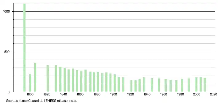 L'évolution du nombre d'habitants est connue à travers les recensements de la population effectués dans la commune depuis 1793. À partir du , les populations légales des communes sont publiées annuellement dans le cadre d'un recensement qui repose désormais sur une collecte d'information annuelle, concernant successivement tous les territoires communaux au cours d'une période de cinq ans. Pour les communes de moins de 10 000 habitants, une enquête de recensement portant sur toute la population est réalisée tous les cinq ans, les populations légales des années intermédiaires étant quant à elles estimées par interpolation ou extrapolation[9]. Pour la commune, le premier recensement exhaustif entrant dans le cadre du nouveau dispositif a été réalisé en 2004[10],[Note 1].