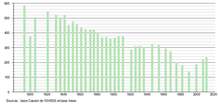 - Dans le tableau des recensements et le graphique, par convention dans Wikipédia, le principe a été retenu, pour les populations légales postérieures à 1999 de n’afficher dans le tableau des recensements et le graphique que les populations correspondant à l'année 2006, première population légale publiée calculée conformément aux concepts définis dans le décret no 2003-485 du 5 juin 2003, et les années correspondant à une enquête exhaustive de recensement pour les communes de moins de 10 000 habitants, ainsi que la dernière population légale publiée par l’Insee.