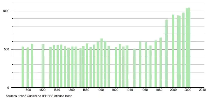 L'évolution du nombre d'habitants est connue à travers les recensements de la population effectués dans la commune depuis 1793. Pour les communes de moins de 10 000 habitants, une enquête de recensement portant sur toute la population est réalisée tous les cinq ans, les populations légales des années intermédiaires étant quant à elles estimées par interpolation ou extrapolation[23]. Pour la commune, le premier recensement exhaustif entrant dans le cadre du nouveau dispositif a été réalisé en 2008[24].