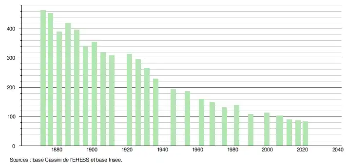 L'évolution du nombre d'habitants est connue à travers les recensements de la population effectués dans la commune depuis 1872. Pour les communes de moins de 10 000 habitants, une enquête de recensement portant sur toute la population est réalisée tous les cinq ans, les populations légales des années intermédiaires étant quant à elles estimées par interpolation ou extrapolation[27]. Pour la commune, le premier recensement exhaustif entrant dans le cadre du nouveau dispositif a été réalisé en 2007[28].
