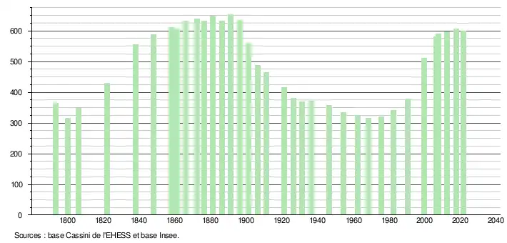 L'évolution du nombre d'habitants est connue à travers les recensements de la population effectués dans la commune depuis 1793. Pour les communes de moins de 10 000 habitants, une enquête de recensement portant sur toute la population est réalisée tous les cinq ans, les populations légales des années intermédiaires étant quant à elles estimées par interpolation ou extrapolation[14]. Pour la commune, le premier recensement exhaustif entrant dans le cadre du nouveau dispositif a été réalisé en 2007[15].