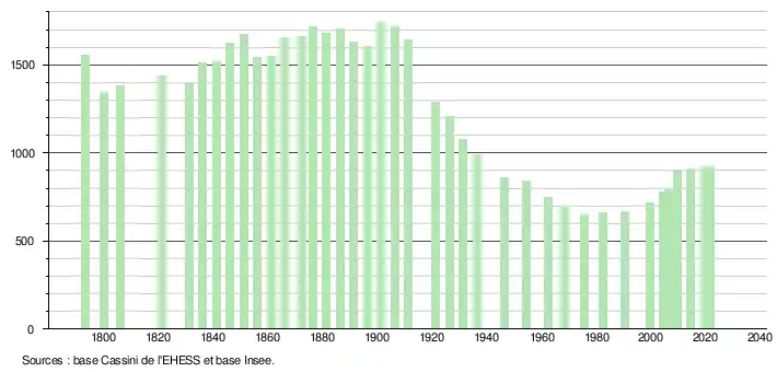 L'évolution du nombre d'habitants est connue à travers les recensements de la population effectués dans la commune depuis 1793. Pour les communes de moins de 10 000 habitants, une enquête de recensement portant sur toute la population est réalisée tous les cinq ans, les populations légales des années intermédiaires étant quant à elles estimées par interpolation ou extrapolation[24]. Pour la commune, le premier recensement exhaustif entrant dans le cadre du nouveau dispositif a été réalisé en 2004[25].