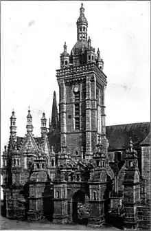 L'église actuelle de Saint-Thégonnec, bâtie à l'emplacement de la première église, appartient à plusieurs époques échelonnées de 1520 à 1667 environ[2]. Le petit clocher a été achevé en 1563, mais par rivalité avec l'église voisine de Pleyben, les paroissiens décidèrent en 1599 la construction d'un second clocher beaucoup plus imposant. Le clocher-porche de style Beaumanoir date de 1653 ; les statues en kersantite qui l'ornent ont été réalisées par Roland Doré en 1625[4].