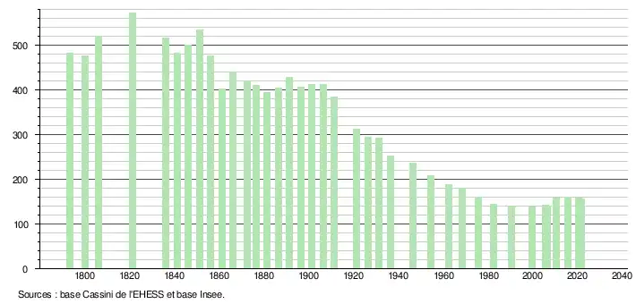 L'évolution du nombre d'habitants est connue à travers les recensements de la population effectués dans la commune depuis 1793. Pour les communes de moins de 10 000 habitants, une enquête de recensement portant sur toute la population est réalisée tous les cinq ans, les populations légales des années intermédiaires étant quant à elles estimées par interpolation ou extrapolation[19]. Pour la commune, le premier recensement exhaustif entrant dans le cadre du nouveau dispositif a été réalisé en 2005[20].