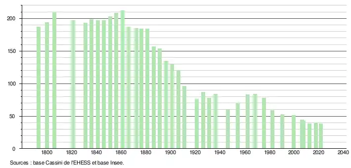 L'évolution du nombre d'habitants est connue à travers les recensements de la population effectués dans la commune depuis 1793. Pour les communes de moins de 10 000 habitants, une enquête de recensement portant sur toute la population est réalisée tous les cinq ans, les populations légales des années intermédiaires étant quant à elles estimées par interpolation ou extrapolation[21]. Pour la commune, le premier recensement exhaustif entrant dans le cadre du nouveau dispositif a été réalisé en 2007[22].
