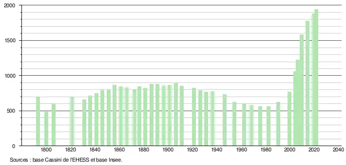 L'évolution du nombre d'habitants est connue à travers les recensements de la population effectués dans la commune depuis 1793. Pour les communes de moins de 10 000 habitants, une enquête de recensement portant sur toute la population est réalisée tous les cinq ans, les populations légales des années intermédiaires étant quant à elles estimées par interpolation ou extrapolation[18]. Pour la commune, le premier recensement exhaustif entrant dans le cadre du nouveau dispositif a été réalisé en 2004[19].
