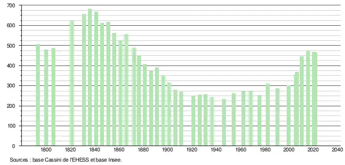 L'évolution du nombre d'habitants est connue à travers les recensements de la population effectués dans la commune depuis 1793. Pour les communes de moins de 10 000 habitants, une enquête de recensement portant sur toute la population est réalisée tous les cinq ans, les populations légales des années intermédiaires étant quant à elles estimées par interpolation ou extrapolation[21]. Pour la commune, le premier recensement exhaustif entrant dans le cadre du nouveau dispositif a été réalisé en 2005[22].
