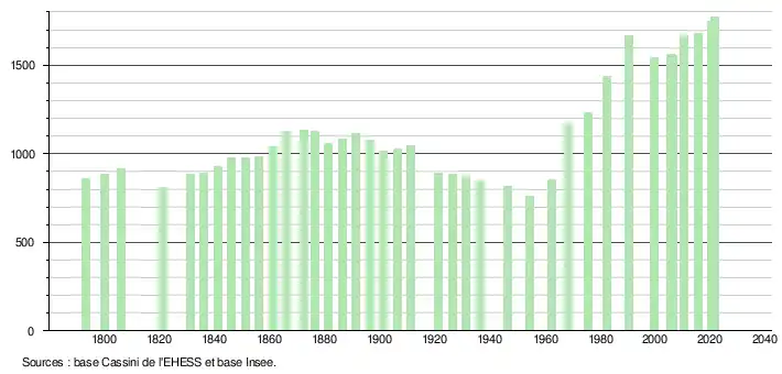 L'évolution du nombre d'habitants est connue à travers les recensements de la population effectués dans la commune depuis 1793. Pour les communes de moins de 10 000 habitants, une enquête de recensement portant sur toute la population est réalisée tous les cinq ans, les populations légales des années intermédiaires étant quant à elles estimées par interpolation ou extrapolation[22]. Pour la commune, le premier recensement exhaustif entrant dans le cadre du nouveau dispositif a été réalisé en 2005[23].