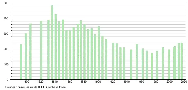 L'évolution du nombre d'habitants est connue à travers les recensements de la population effectués dans la commune depuis 1793. Pour les communes de moins de 10 000 habitants, une enquête de recensement portant sur toute la population est réalisée tous les cinq ans, les populations légales des années intermédiaires étant quant à elles estimées par interpolation ou extrapolation[9]. Pour la commune, le premier recensement exhaustif entrant dans le cadre du nouveau dispositif a été réalisé en 2007[10].