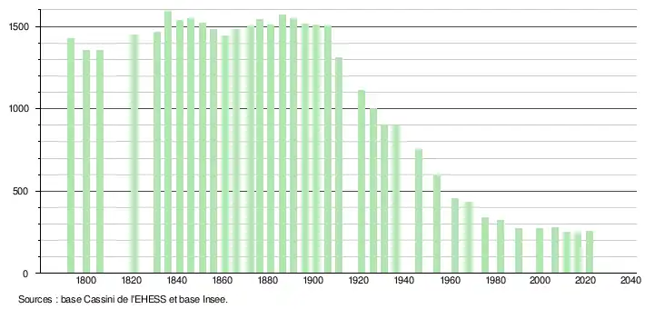 L'évolution du nombre d'habitants est connue à travers les recensements de la population effectués dans la commune depuis 1793. Pour les communes de moins de 10 000 habitants, une enquête de recensement portant sur toute la population est réalisée tous les cinq ans, les populations légales des années intermédiaires étant quant à elles estimées par interpolation ou extrapolation[26]. Pour la commune, le premier recensement exhaustif entrant dans le cadre du nouveau dispositif a été réalisé en 2006[27].