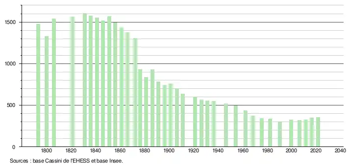 | L'évolution du nombre d'habitants est connue à travers les recensements de la population effectués dans la commune depuis 1793. Pour les communes de moins de 10 000 habitants, une enquête de recensement portant sur toute la population est réalisée tous les cinq ans, les populations légales des années intermédiaires étant quant à elles estimées par interpolation ou extrapolation[43]. Pour la commune, le premier recensement exhaustif entrant dans le cadre du nouveau dispositif a été réalisé en 2006[44]. En 2021, la commune comptait 356 habitants[Note 6], en augmentation de 4,4 % par rapport à 2015 (Hérault : +7,29 %, France hors Mayotte : +1,84 %). |