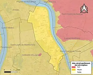 Le retrait-gonflement des sols argileux est susceptible d'engendrer des dommages importants aux bâtiments en cas d’alternance de périodes de sécheresse et de pluie. 89,1 % de la superficie communale est en aléa moyen ou fort (67,4 % au niveau départemental et 48,5 % au niveau national). Sur les 412 bâtiments dénombrés sur la commune en 2019, 412 sont en aléa moyen ou fort, soit 100 %, à comparer aux 84 % au niveau départemental et 54 % au niveau national. Une cartographie de l'exposition du territoire national au retrait gonflement des sols argileux est disponible sur le site du BRGM[32],[Carte 2].