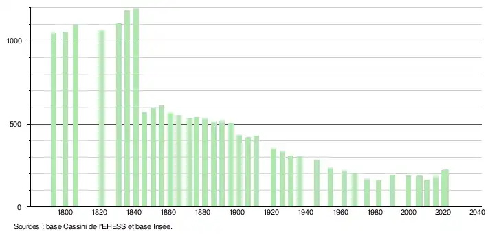 L'évolution du nombre d'habitants est connue à travers les recensements de la population effectués dans la commune depuis 1793. Pour les communes de moins de 10 000 habitants, une enquête de recensement portant sur toute la population est réalisée tous les cinq ans, les populations légales des années intermédiaires étant quant à elles estimées par interpolation ou extrapolation[29]. Pour la commune, le premier recensement exhaustif entrant dans le cadre du nouveau dispositif a été réalisé en 2005[30].