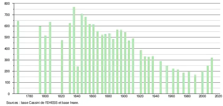 (Sources : Baratier, Duby & Hildesheimer pour l’Ancien Régime[13], EHESS[14], Insee à partir de 1968[38],[39],[40])