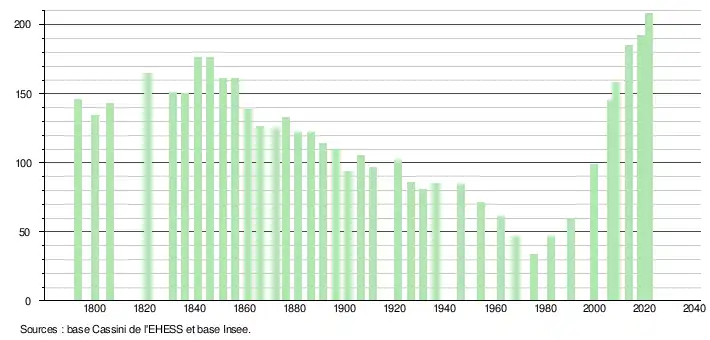 L'évolution du nombre d'habitants est connue à travers les recensements de la population effectués dans la commune depuis 1793. Pour les communes de moins de 10 000 habitants, une enquête de recensement portant sur toute la population est réalisée tous les cinq ans, les populations légales des années intermédiaires étant quant à elles estimées par interpolation ou extrapolation[29]. Pour la commune, le premier recensement exhaustif entrant dans le cadre du nouveau dispositif a été réalisé en 2008[30].