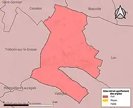 Le retrait-gonflement des sols argileux est susceptible d'engendrer des dommages importants aux bâtiments en cas d’alternance de périodes de sécheresse et de pluie. La totalité de la commune est en aléa moyen ou fort (88,8 % au niveau départemental et 48,5 % au niveau national). Sur les 62 bâtiments dénombrés sur la commune en 2019, 62 sont en aléa moyen ou fort, soit 100 %, à comparer aux 98 % au niveau départemental et 54 % au niveau national. Une cartographie de l'exposition du territoire national au retrait gonflement des sols argileux est disponible sur le site du BRGM[25],[Carte 3].