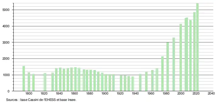 L'évolution du nombre d'habitants est connue à travers les recensements de la population effectués dans la commune depuis 1793. Pour les communes de moins de 10 000 habitants, une enquête de recensement portant sur toute la population est réalisée tous les cinq ans, les populations légales des années intermédiaires étant quant à elles estimées par interpolation ou extrapolation[24]. Pour la commune, le premier recensement exhaustif entrant dans le cadre du nouveau dispositif a été réalisé en 2007[25].