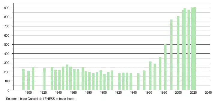 L'évolution du nombre d'habitants est connue à travers les recensements de la population effectués dans la commune depuis 1793. Pour les communes de moins de 10 000 habitants, une enquête de recensement portant sur toute la population est réalisée tous les cinq ans, les populations légales des années intermédiaires étant quant à elles estimées par interpolation ou extrapolation[46]. Pour la commune, le premier recensement exhaustif entrant dans le cadre du nouveau dispositif a été réalisé en 2008[47].