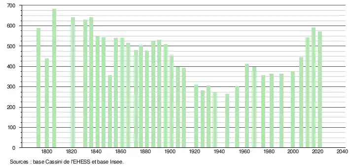 L'évolution du nombre d'habitants est connue à travers les recensements de la population effectués dans la commune depuis 1793. Pour les communes de moins de 10 000 habitants, une enquête de recensement portant sur toute la population est réalisée tous les cinq ans, les populations légales des années intermédiaires étant quant à elles estimées par interpolation ou extrapolation[17]. Pour la commune, le premier recensement exhaustif entrant dans le cadre du nouveau dispositif a été réalisé en 2006[18].