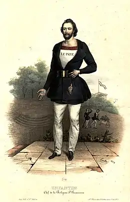 Barthélemy Prosper Enfantin assiste à l'enterrement de Saint-Simon en 1825. C'est à ce moment qu'il reprend la doctrine de Saint-Simon. Avec Olinde Rodrigues et Saint-Amand Bazard, il fonde une communauté à Ménilmontant (no 145 rue de Ménilmontant), qui dégénère en une sorte de religiosité (1829 à 1832)[18], dénoncée par certains contemporains comme une secte[19]. Enfantin et Bazard se font appeler « Pères suprêmes ». Ils font paraître en 1829 et 1830 l'Exposition de la Doctrine de Saint-Simon.