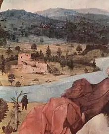 Au fond, on peut voir une ville en feu, des ruines d'un château d'où émerge un dragon devant lequel s'enfuit un homme nu. À gauche, à l'avant, des restes d'un navire naufragé dont on perçoit des mâts, ce détail a aussi été vu comme un nasse par Bax[1]. En dessous, la signature de Jérôme Bosch. Un petit oratoire, comme on les trouve souvent au bord des chemins, est cloué au tronc de l’arbre. On y voit aussi une bête morte, peut-être accrochée pour la faire faisander.