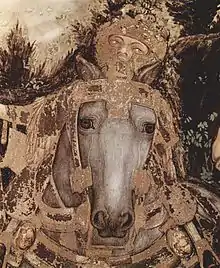 La princesse, aux traits nobles et très fins, regarde la scène en silence, avec derrière elle, trois chevaux montés par des cavaliers, un de face et deux de profil, et un bélier accroupi. Sur la gauche, se tiennent un lévrier et un chien de compagnie. La richesse des armures et des harnachements des montures sont extraordinaires, tout comme le raffinement des robes et des coiffures de la princesse et de son entourage. Celle-ci est peinte de profil, comme les effigies des médailles. Elle a une coiffure très élaborée : des bandes retiennent la grande masse de cheveux en suspension, l'implantation des cheveux est très haute, selon la mode des premières décennies du siècle, obtenue en épilant les cheveux sur le front et les tempes avec une bougie allumée[3]. Sa somptueuse robe est faite de tissu et de fourrure, tandis que les animaux démontrent, une fois de plus, la prédilection de l'artiste pour des représentations aigües et réalistes de la nature.