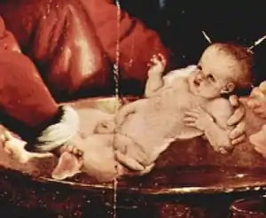 - Lorenzo Lotto a peint vers 1527 une Nativité (conservée à la Pinacothèque nationale de Sienne) où l'on voit Jésus au bain et son cordon ombilical.