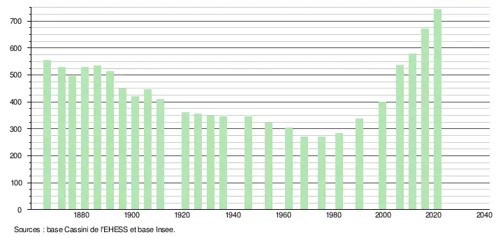L'évolution du nombre d'habitants est connue à travers les recensements de la population effectués dans la commune depuis 1866. Pour les communes de moins de 10 000 habitants, une enquête de recensement portant sur toute la population est réalisée tous les cinq ans, les populations légales des années intermédiaires étant quant à elles estimées par interpolation ou extrapolation[15]. Pour la commune, le premier recensement exhaustif entrant dans le cadre du nouveau dispositif a été réalisé en 2006[16].