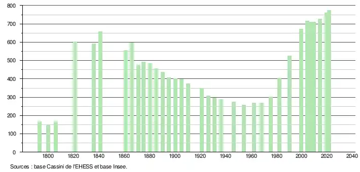 L'évolution du nombre d'habitants est connue à travers les recensements de la population effectués dans la commune depuis 1793. Pour les communes de moins de 10 000 habitants, une enquête de recensement portant sur toute la population est réalisée tous les cinq ans, les populations légales des années intermédiaires étant quant à elles estimées par interpolation ou extrapolation[18]. Pour la commune, le premier recensement exhaustif entrant dans le cadre du nouveau dispositif a été réalisé en 2004[19].